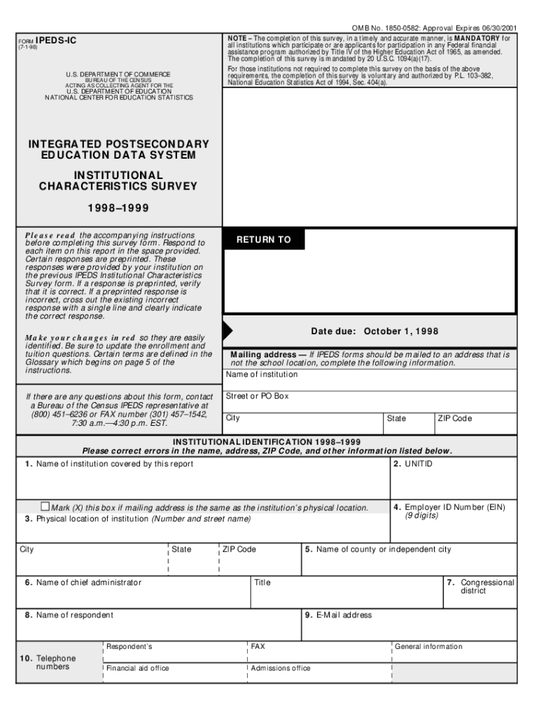IPEDSICFORM (7198)U.S. DEPARTMENT OF COMMERCE BUREAU OF THE CENSUS ACTING AS COLLECTING AGENT FOR THE OMB No. 18500582: Approval Expires 06/30/2001 NOTE The completion of this survey, in a timely