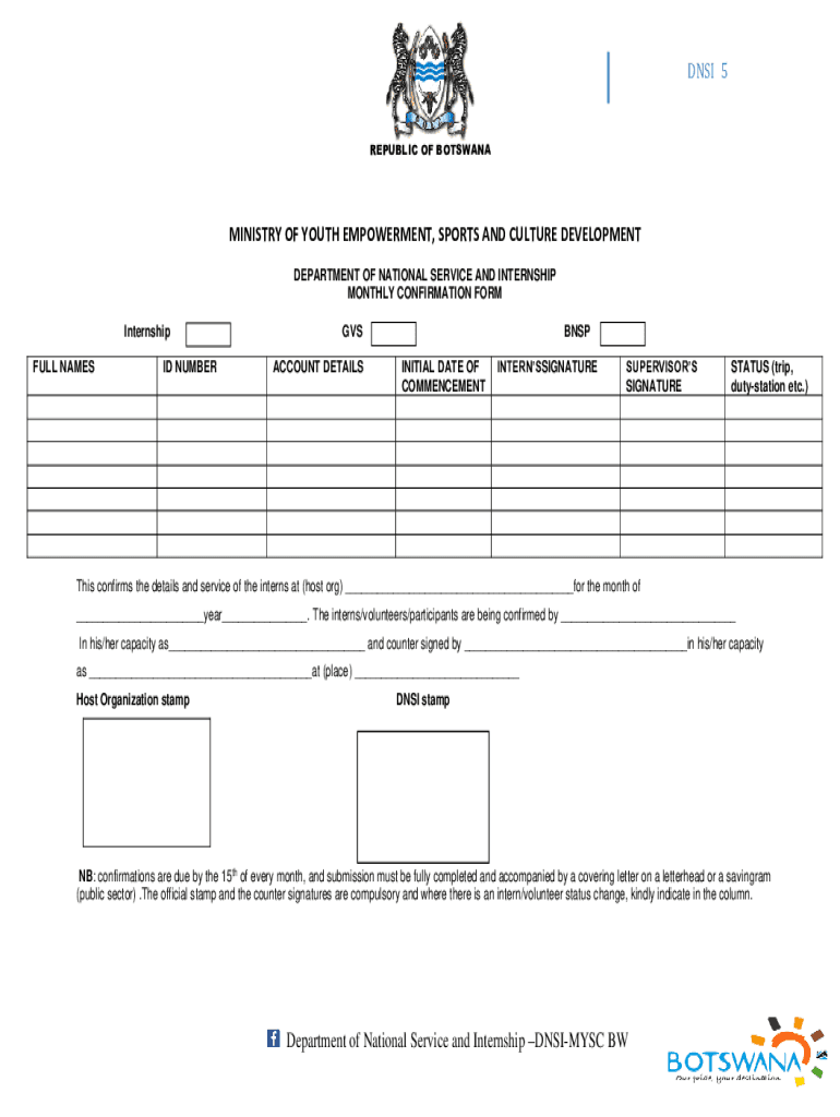 ANSI 5REPUBLIC OF BOTSWANAMINISTRY OF YOUTH EMPOWERMENT, SPORTS AND CULTURE DEVELOPMENT DEPARTMENT OF NATIONAL SERVICE AND INTERNSHIP MONTHLY CONFIRMATION FORM Internship FULL NAME SID NUMBERS ACCOUNT