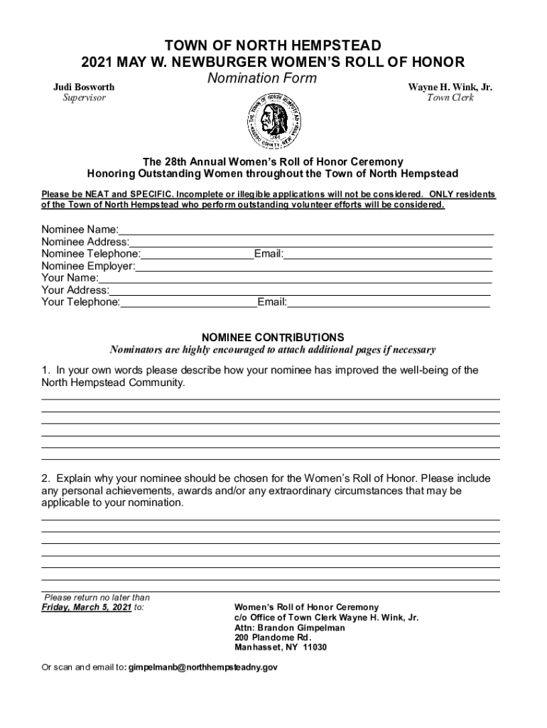 Anyone who has made noteworthy achievements, contributions, or service to the town of North Hempstead may need the northhempsteadnygovroll-of-honortown.