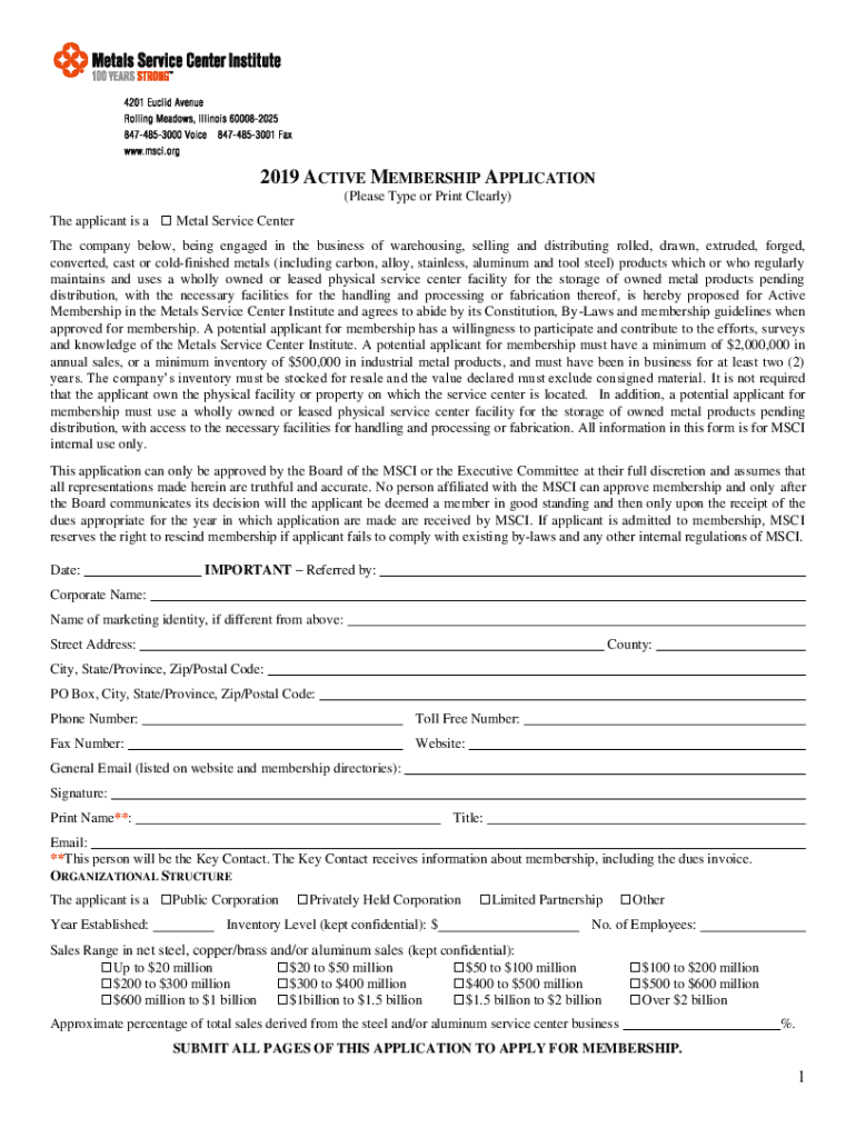 2019 ACTIVE MEMBERSHIP APPLICATION (Please Type or Print Clearly) The applicant is a Metal Service Center The company below, being engaged in the business of warehousing, selling and distributing