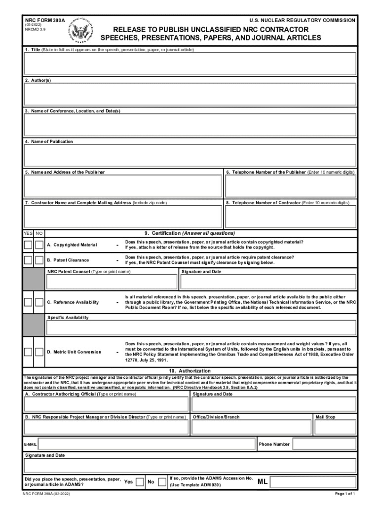 NRC FORM 390A (032022) NR CMD 3.9U. S. NUCLEAR REGULATORY COMMISSIONRELEASE TO PUBLISH UNCLASSIFIED NRC CONTRACTOR SPEECHES, PRESENTATIONS, PAPERS, AND JOURNAL ARTICLES1. Title (State in full as it