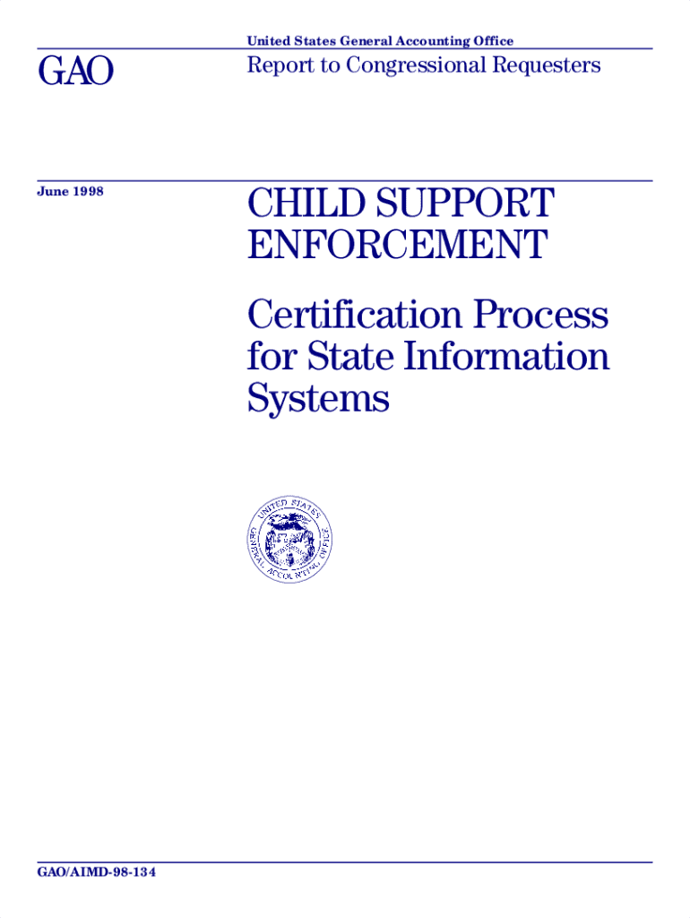 United States General Accounting OfficeGAOReport to Congressional RequestersJune 1998CHILD SUPPORT ENFORCEMENT Certification Process for State Information Systems GAO/AIMD98134GAOUnited States General