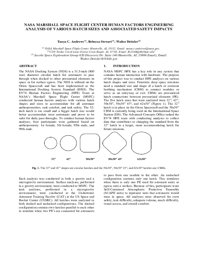 NASA MARSHALL SPACE FLIGHT CENTER HUMAN FACTORS ENGINEERING ANALYSIS OF VARIOUS HATCH SIZES AND ASSOCIATED SAFETY IMPACTS Tanya C. Andrews(1), Rebecca Stewart(1), Walter Dazzler(2) (1)(3)NASA Marshall