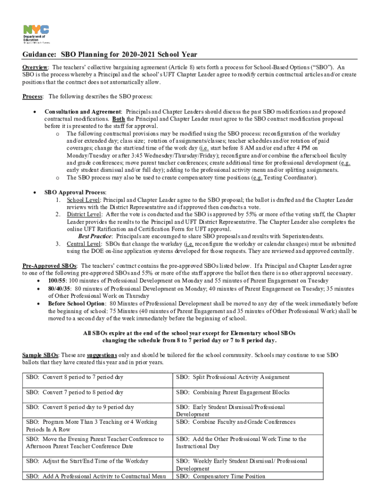 Guidance: SO Planning for 20202021 School Year Overview: The teachers collective bargaining agreement (Article 8) sets forth a process for Schooled Options (SO). And SO is the process whereby a Principal