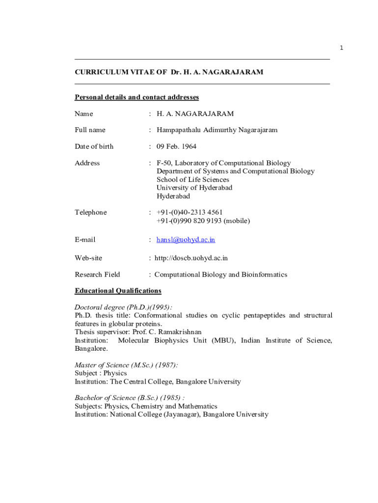 1___ CURRICULUM VITAE OF Dr. H. A. NAGARAJARAM ___ Personal details and contact addresses Name: H. A. NAGARAJARAMFull name: Hampapathalu Azimuth NagarajaramDate of birth: 09 Feb. 1964Address: F50,