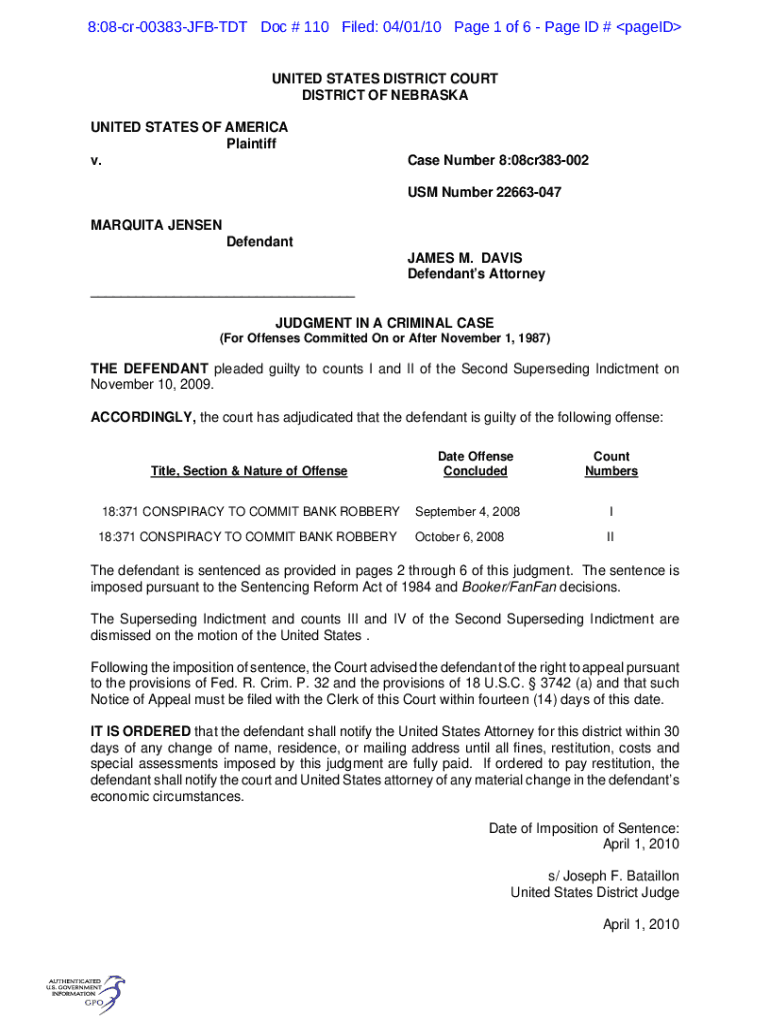 8:08cr00383JFBTDT Doc # 110 Filed: 04/01/10-Page 1 of 6-Page ID # paged UNITED STATES DISTRICT COURT DISTRICT OF NEBRASKA UNITED STATES OF AMERICA Plaintiff v. Case Number 8:08cr383002 US Number 22663047MARQUITA