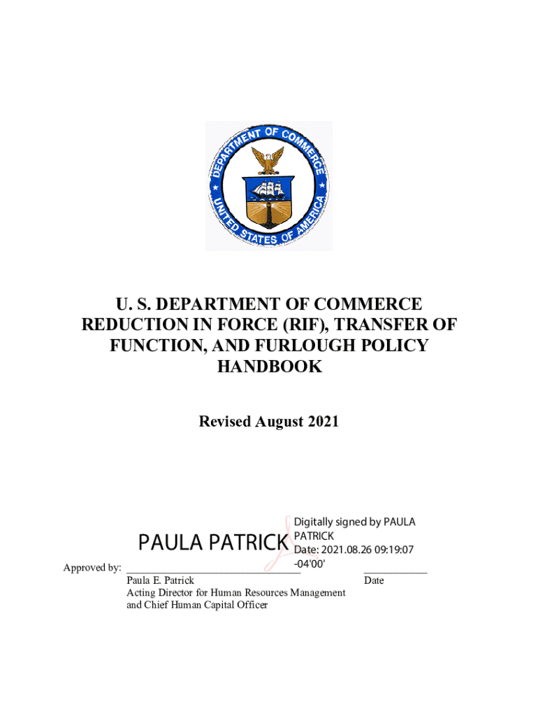 U. S. DEPARTMENT OF COMMERCE REDUCTION IN FORCE (RIF), TRANSFER OF FUNCTION, AND FURLOUGH POLICY HANDBOOK Revised August 2021Digitally signed by PAULA PATRICK Date: 2021.08.26 09:19:07 04\'00\' Approved