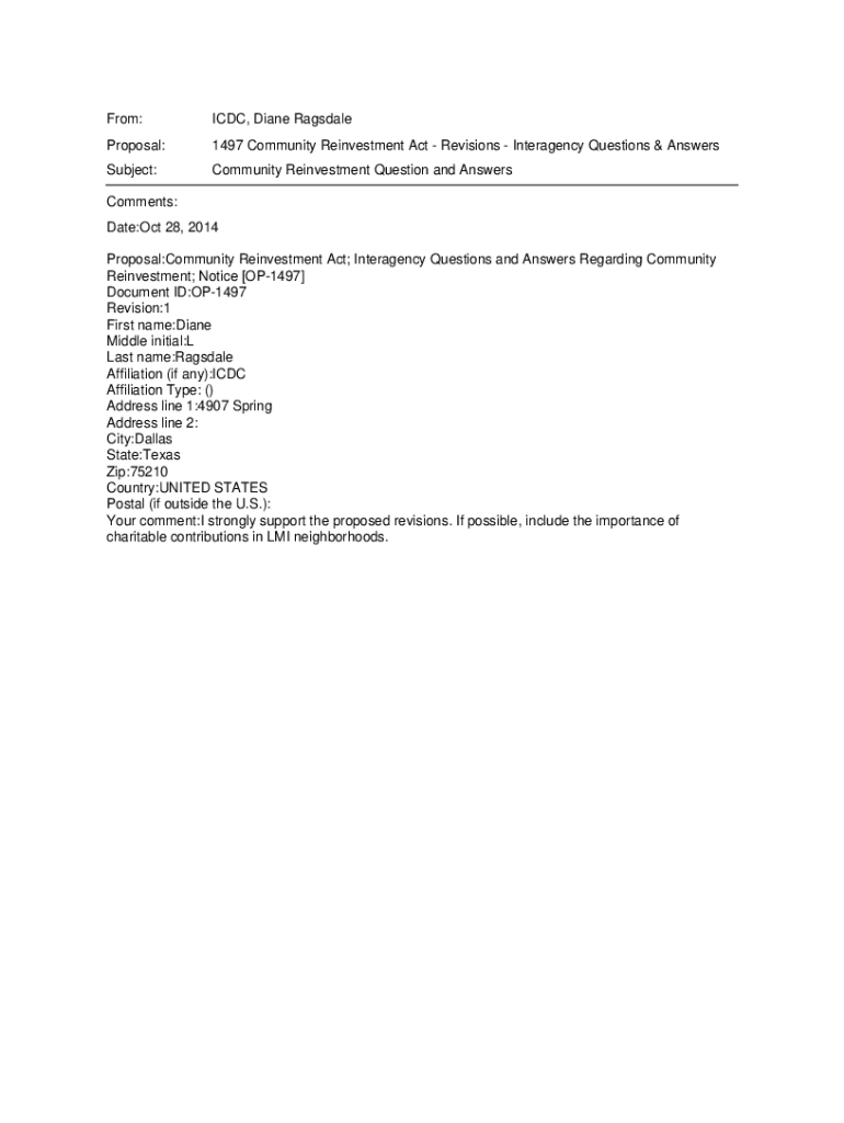 From:CDC, Diane RagsdaleProposal:1497 Community Reinvestment Act Revisions Interagency Questions & AnswersSubject:Community Reinvestment Question and AnswersComments: Date:Oct 28, 2014 Proposal:Community