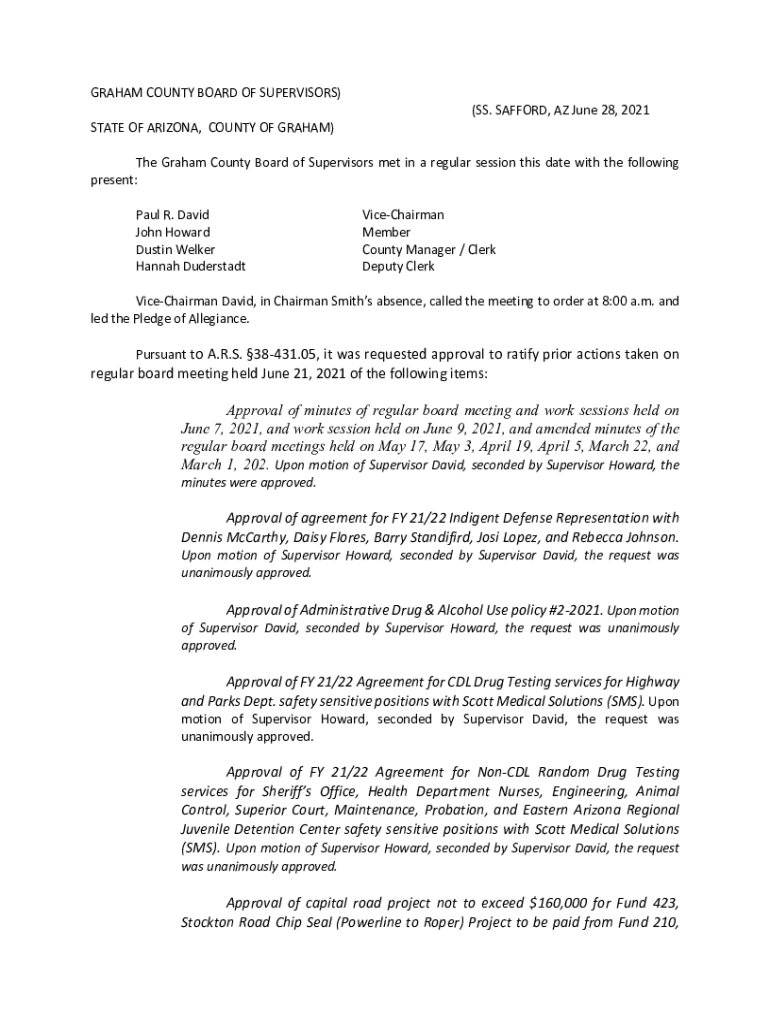 GRAHAMCOUNTYBOARDOFSUPERVISORS) (SS.AFFORD,AZJune28,2021 STATEOFARIZONA, COUNTYOFGRAHAM) TheGrahamCountyBoardofSupervisorsmetinaregularsessionthisdatewiththefollowing present: Paul. David ViceChairman