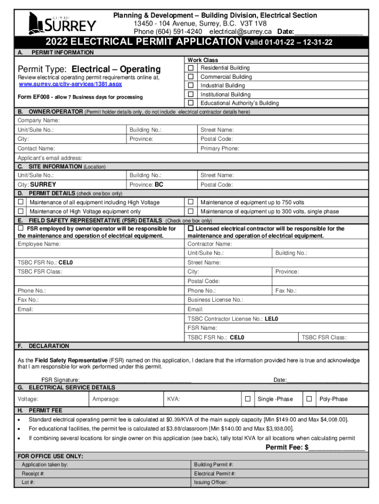 Planning & Development Building Division, Electrical Section 13450 104 Avenue, Surrey, B.C. V3T 1V8 Phone (604) 5914240 electrical×surrey.ca Date:___2022 ELECTRICAL PERMIT APPLICATION Valid 010122