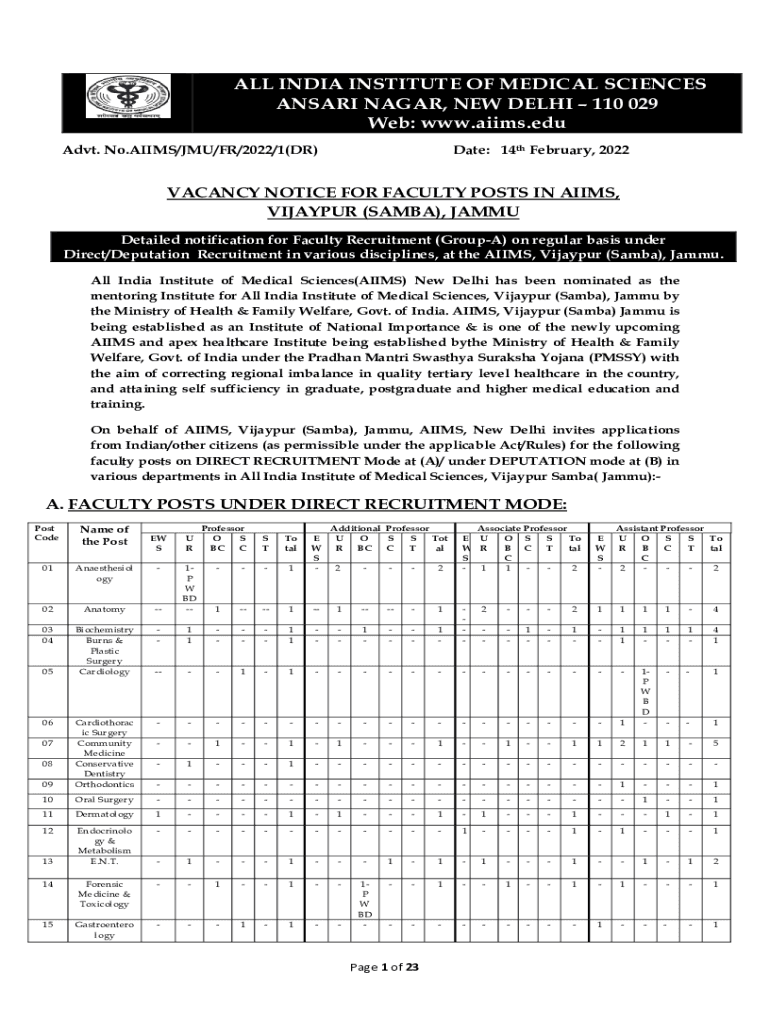 ALL INDIA INSTITUTE OF MEDICAL SCIENCES ANSARI NAGAR, NEW DELHI 110 029 Web: www.aiims.edu Advt. No.AIIMS/JMU/FR/2022/1(DR)Date: 14th February, 2022VACANCY NOTICE FOR FACULTY POSTS IN AIMS, JAIPUR