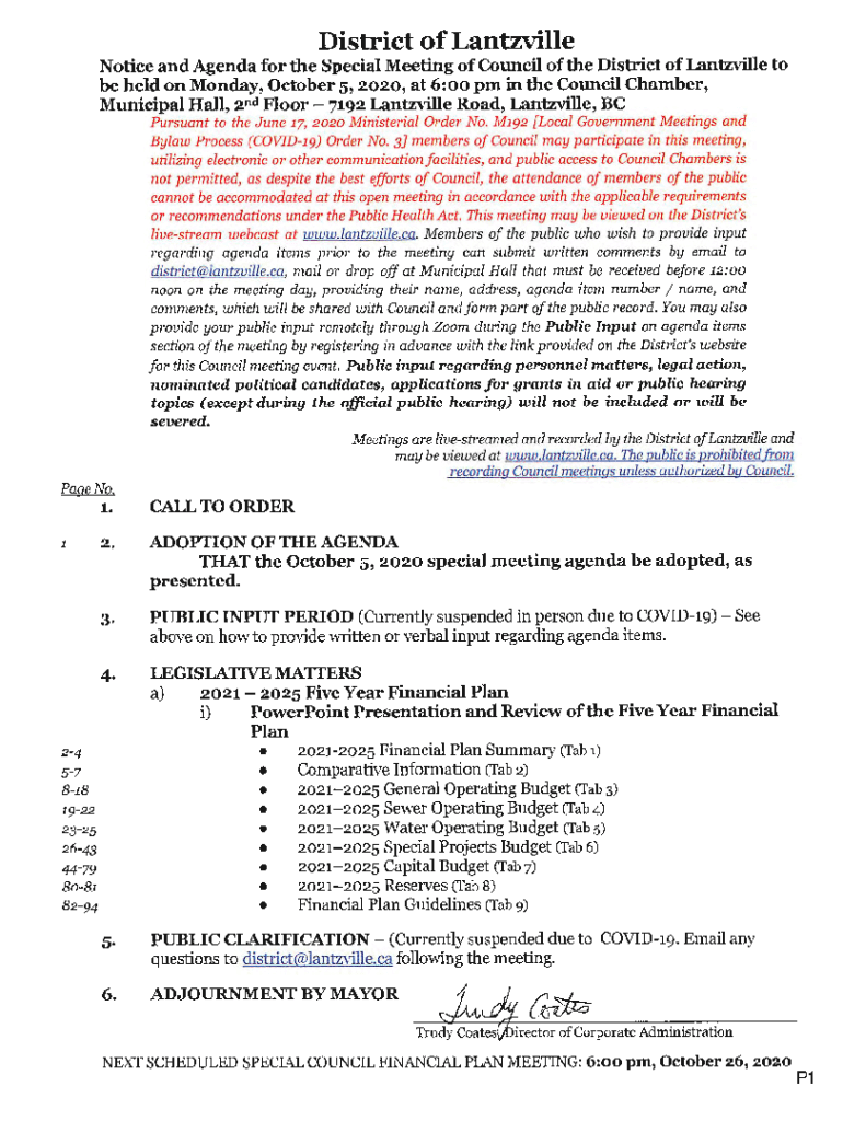 District of Wentzville Notice and Agenda for the Special Meeting of Council of the District of Wentzville to be held on Monday, October 5, 2020, at 6:OO pm in the Council Chamber, Municipal Hall,