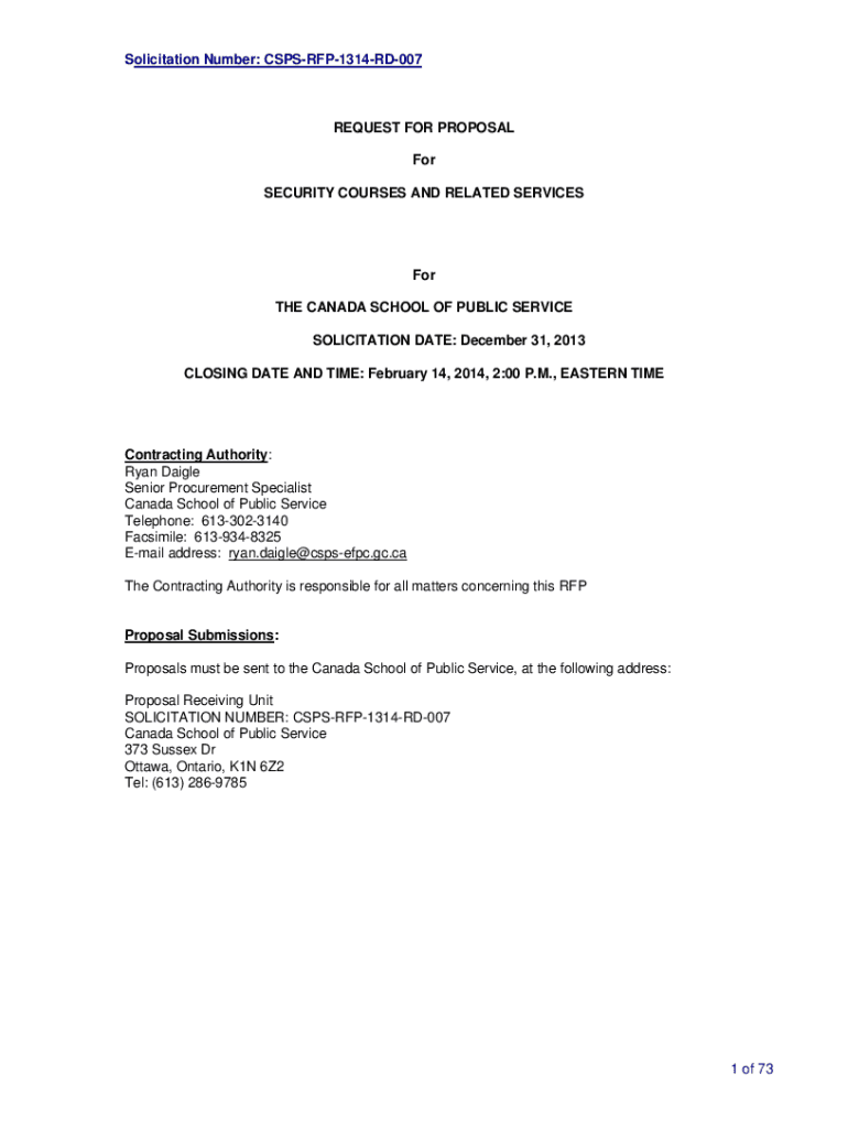 Solicitation Number: CSPSRFP1314RD007REQUEST FOR PROPOSAL For SECURITY COURSES AND RELATED Services THE CANADA SCHOOL OF PUBLIC SERVICE SOLICITATION DATE: December 31, 2013, CLOSING DATE AND TIME: