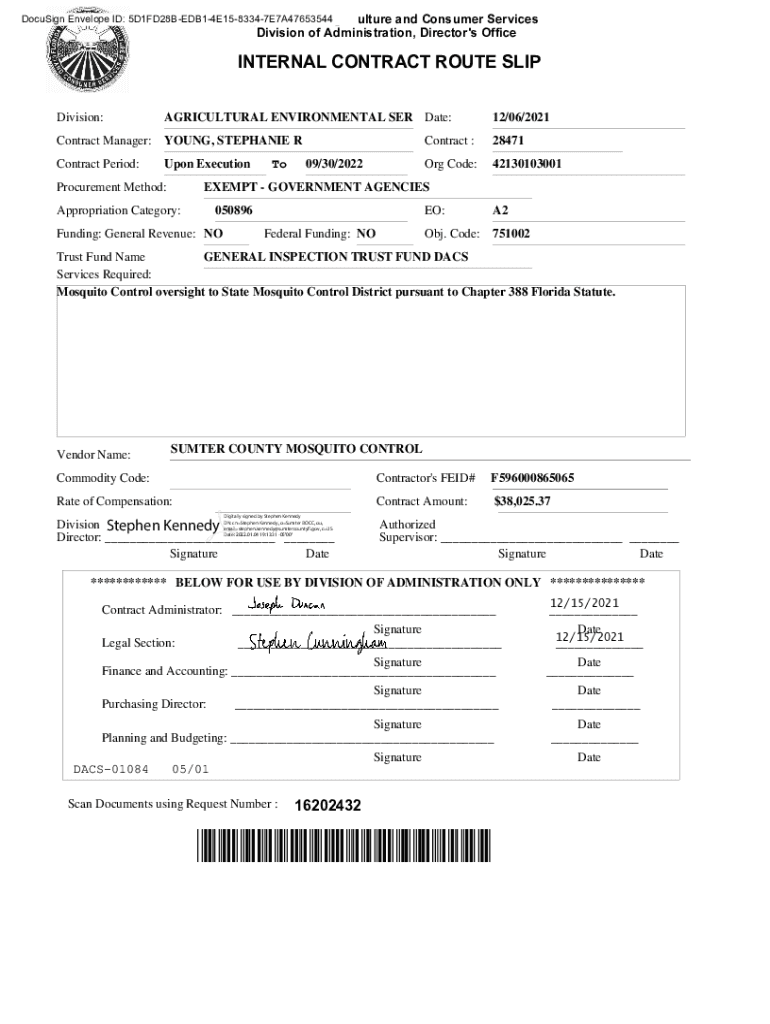 DocuSign Envelope ID: 5D1FD28BEDB14E1583347E7A47653544 Department of Agriculture and Consumer Services Division of Administration, Director\'s OfficeINTERNAL CONTRACT ROUTE SLIP Division:AGRICULTURAL