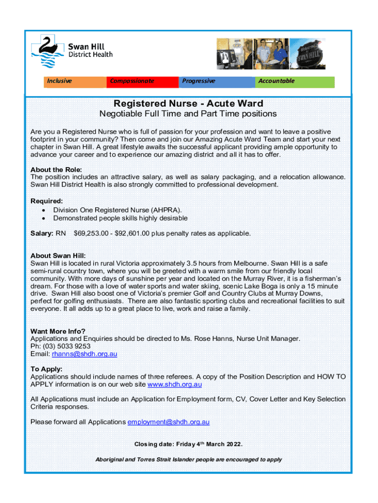 InclusiveCompassionateProgressiveAccountableRegistered Nurse Acute Ward Negotiable Full Time and Part Time positions Are you a Registered Nurse who is full of passion for your profession and want