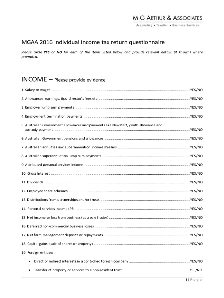 GAA 2016 individual income tax return questionnaire Please circle YES or NO for each of the items listed below and provide relevant details (if known) where prompted. INCOME Please provide evidence