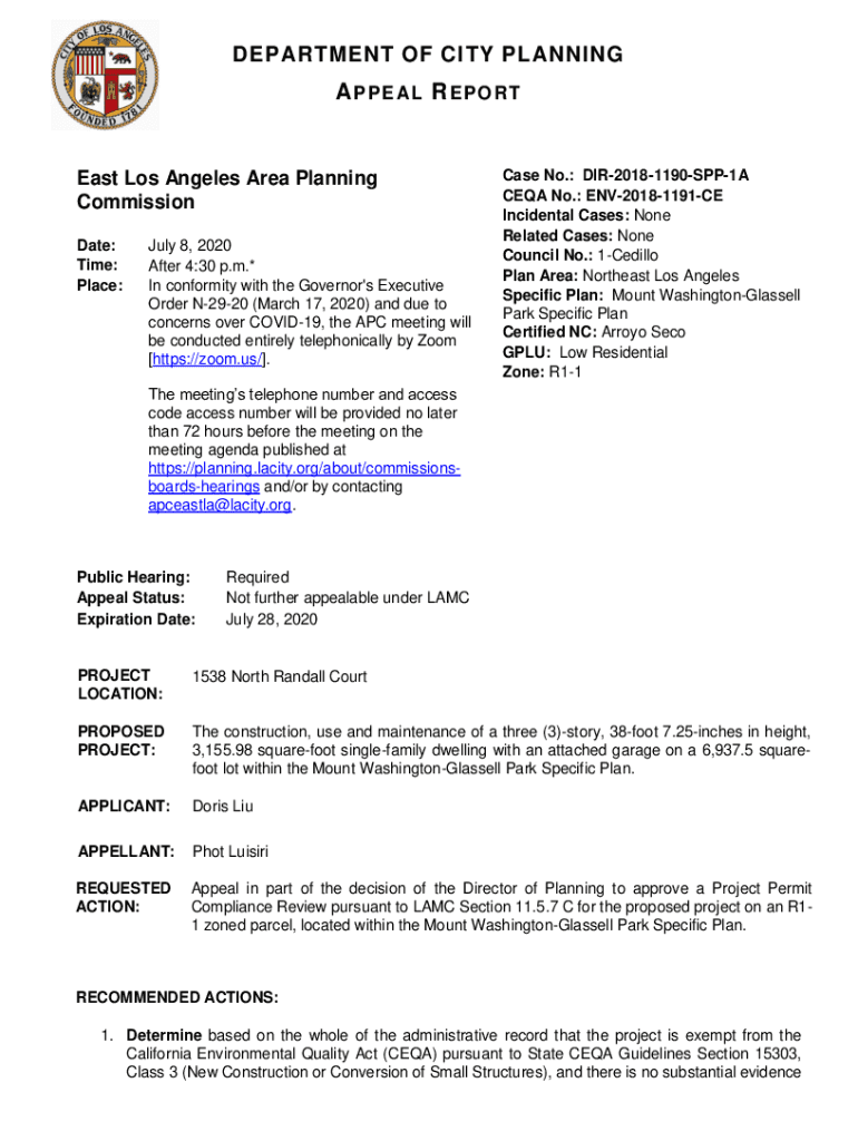 DEPARTMENT OF CITY PLANNING P E AL R E P O RT East Los Angeles Area Planning Commission Date: Time: Place:July 8, 2020, After 4:30 p.m.* In conformity with the Governor\'s Executive Order N2920 (March