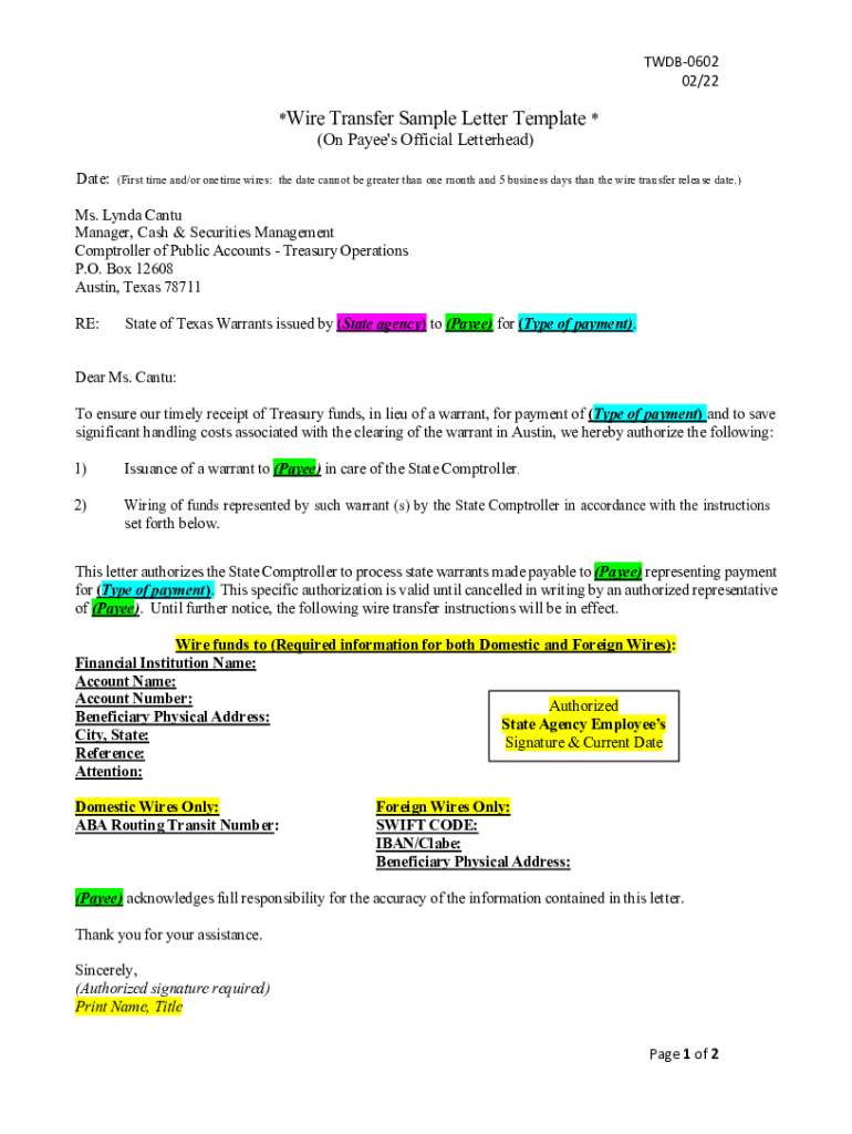 TWDB0602 02/22×Wire Transfer Sample Letter Template * (On Payee\'s Official Letterhead) Date:(First time and/or onetime wires: the date cannot be greater than one month and 5 business days than the
