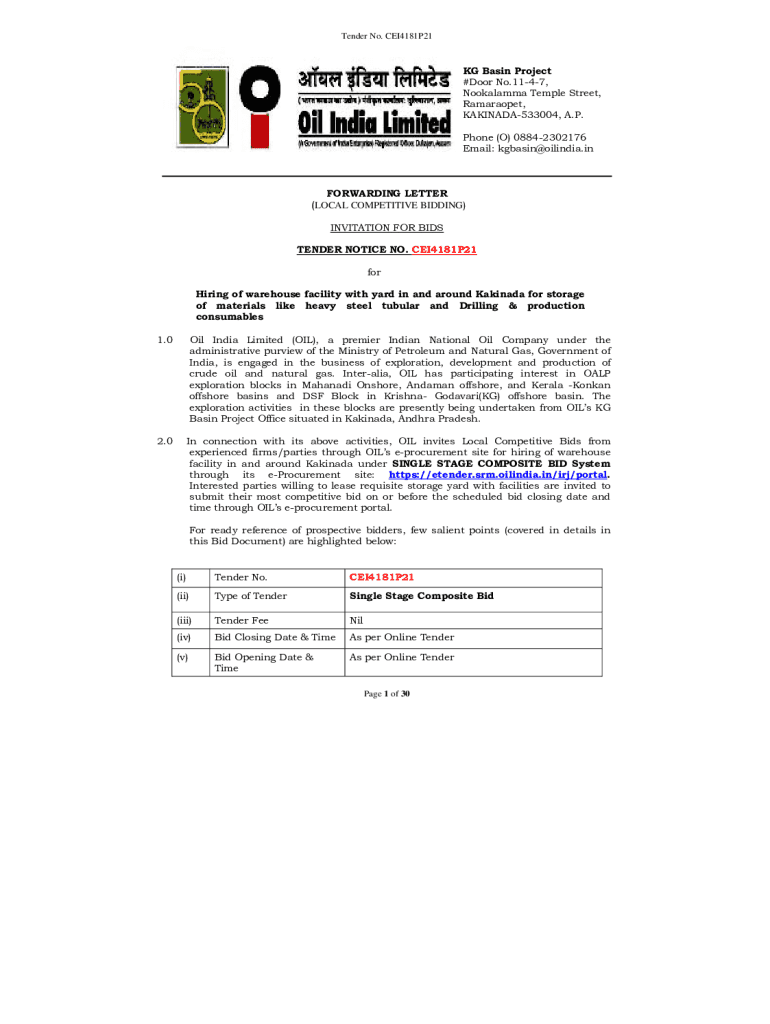 Tender No. CEI4181P21KG Basin Project #Door No.1147, Nookalamma Temple Street, Ramaraopet, KAKINADA533004, A.P. Phone (O) 08842302176 Email: kg basin×India.forwarding LETTER(LOCAL COMPETITIVE BIDDING)