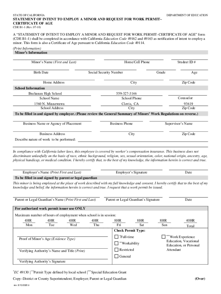 STATE OF CALIFORNIADEPARTMENT OF EDUCATIONSTATEMENT OF INTENT TO EMPLOY A MINOR AND REQUEST FOR WORK PERMIT CERTIFICATE OF AGE CDE B11 (Rev. 0710)A STATEMENT OF INTENT TO EMPLOY A MINOR AND REQUEST