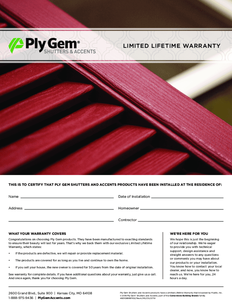 LIMITED LIFETIME WARRANTYTHIS IS TO CERTIFY THAT PLY GEM SHUTTERS AND ACCENTS PRODUCTS HAVE BEEN INSTALLED AT THE RESIDENCE OF:Name Date of InstallationAddressHomeowner ContractorWHAT YOUR WARRANTY