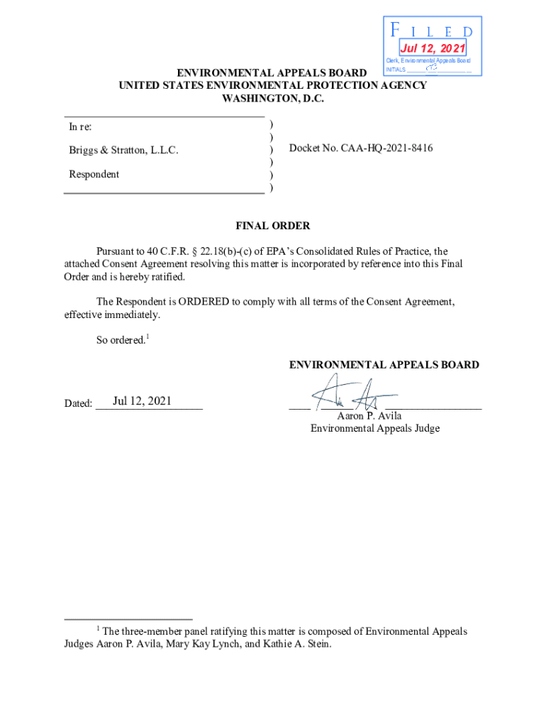 F IL E DJul 12, 2021Clerk, Environmental mental A Appeals Board INITIALS ___ ___ ENVIRONMENTAL APPEALS BOARD UNITED STATES ENVIRONMENTAL PROTECTION AGENCY WASHINGTON, D.C. In re: Briggs & Stratton,