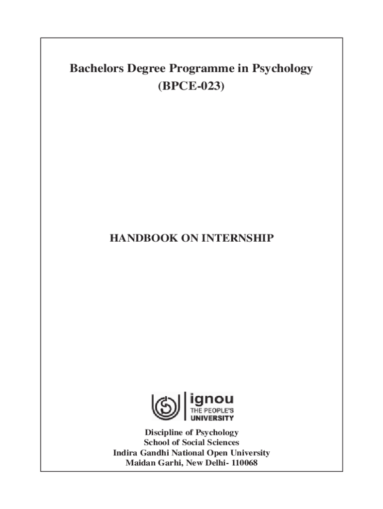 Bachelors Degree Program in Psychology (BPCE023)HANDBOOK ON INTERNSHIPDiscipline of Psychology School of Social Sciences Indira Gandhi National Open University Maidan Gar hi, New Delhi 110068Programme