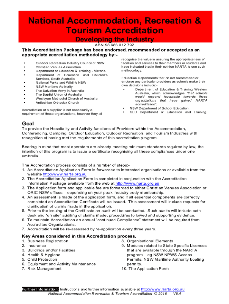 National Accommodation, Recreation & Tourism Accreditation Developing the Industry ABN 98 686 012 792This Accreditation Package has been endorsed, recommended or accepted as an appropriate accreditation