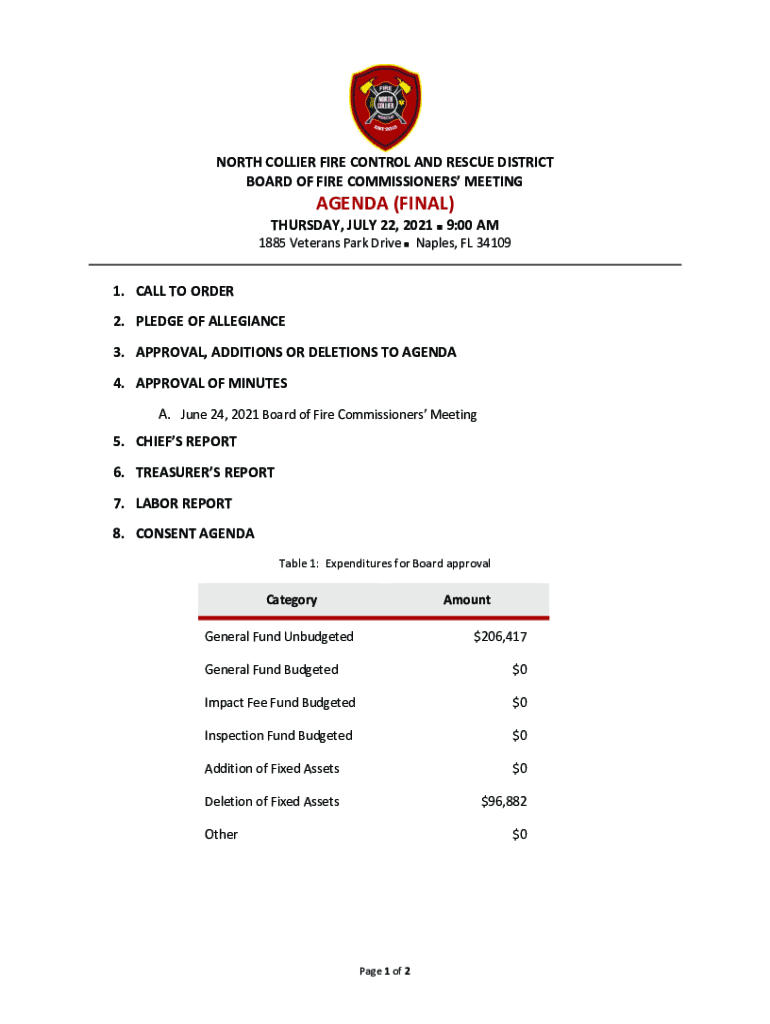 NORTH COLLIER FIRE CONTROL AND RESCUE DISTRICT BOARD OF FIRE COMMISSIONERS MEETINGAGENDA (FINAL) THURSDAY, JULY 22, 2021 9:00 AM 1885 Veterans Park Drive Naples, FL 341091. CALL TO ORDER 2. PLEDGE