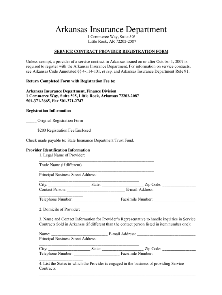 Arkansas Insurance Department 1 Commerce Way, Suite 505 Little Rock, AR 722022087SERVICE CONTRACT PROVIDER REGISTRATION FORM Unless exempt, a provider of a service contract in Arkansas issued on or