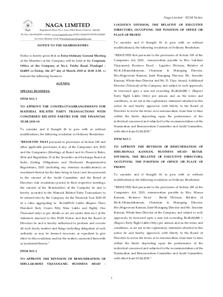 Nāga Limited EGG Noticing LIMITEDLOGISTICS DIVISION, THE RELATIVE OF EXECUTIVE DIRECTORS, OCCUPYING THE POSITION OF OFFICE Registered Office: No.1, Anna Pillar Street, Chennai 600 001. PH /Fax: 04425363535