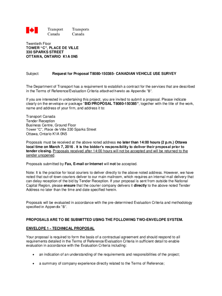 Transport CanadaTransports CanadaTwentieth Floor TOWER C, PLACE DE VILLA 330 SPARKS STREET OTTAWA, ONTARIO K1A 0N5Subject:Request for Proposal T8080150385 CANADIAN VEHICLE USE Survey Department of