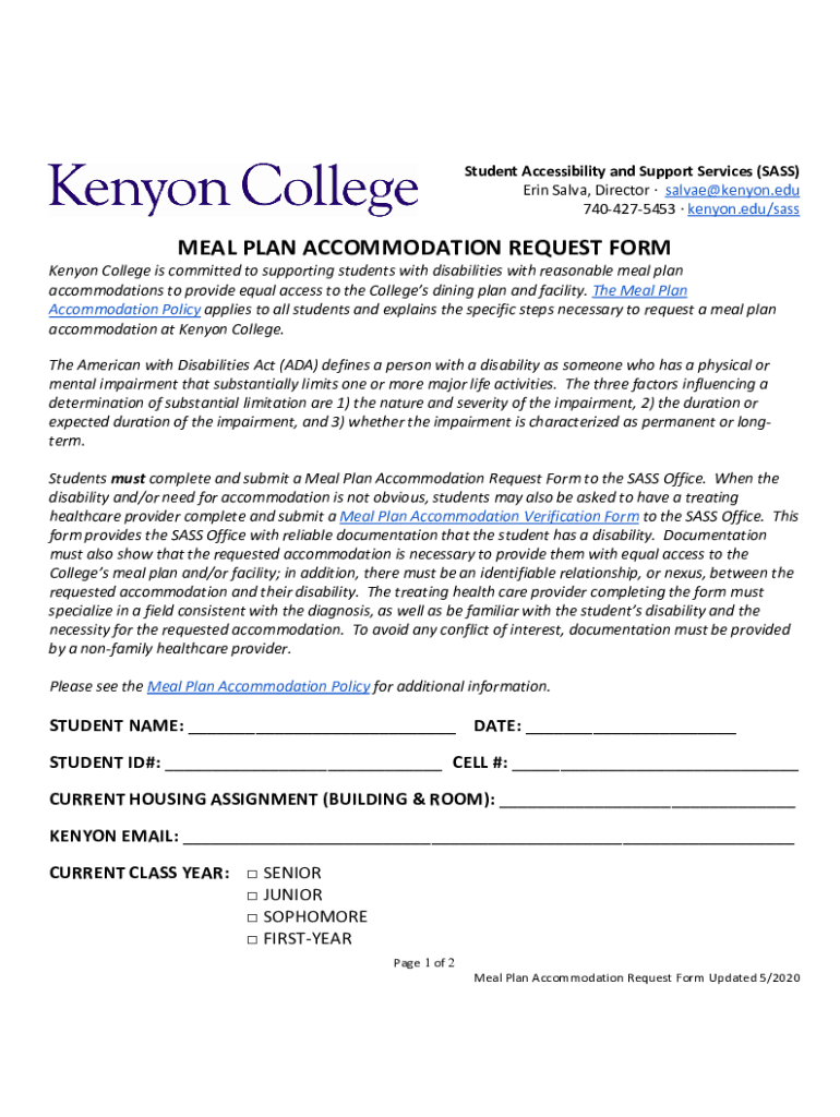 StudentAccessibilityandSupportServices(SASS) ErinSalva, Directorsalvae@Kenyon.edu 7404275453kenyon.edu/sassMEALPLANACCOMMODATIONREQUESTFORM KenyonCollegeiscommittedtosupportingstudentswithdisabilitieswithreasonablemealplan