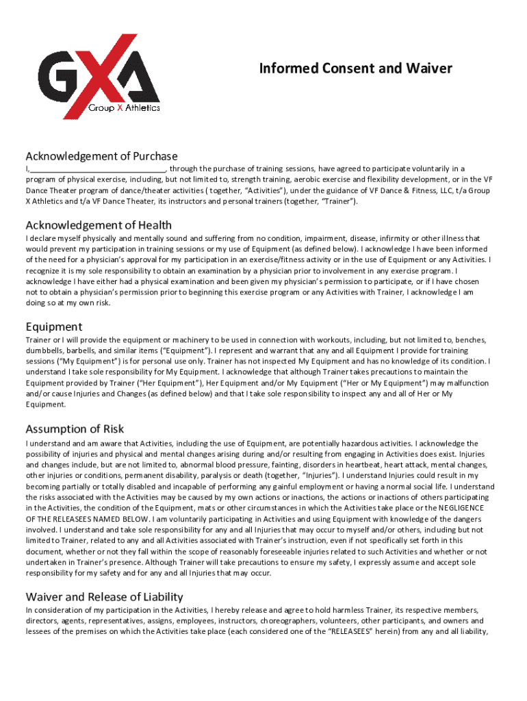 Informed Consent and WaiverAcknowledgement of Purchased, through the purchase of training sessions, have agreed to participate voluntarily in a program of physical exercise, including, but not limited