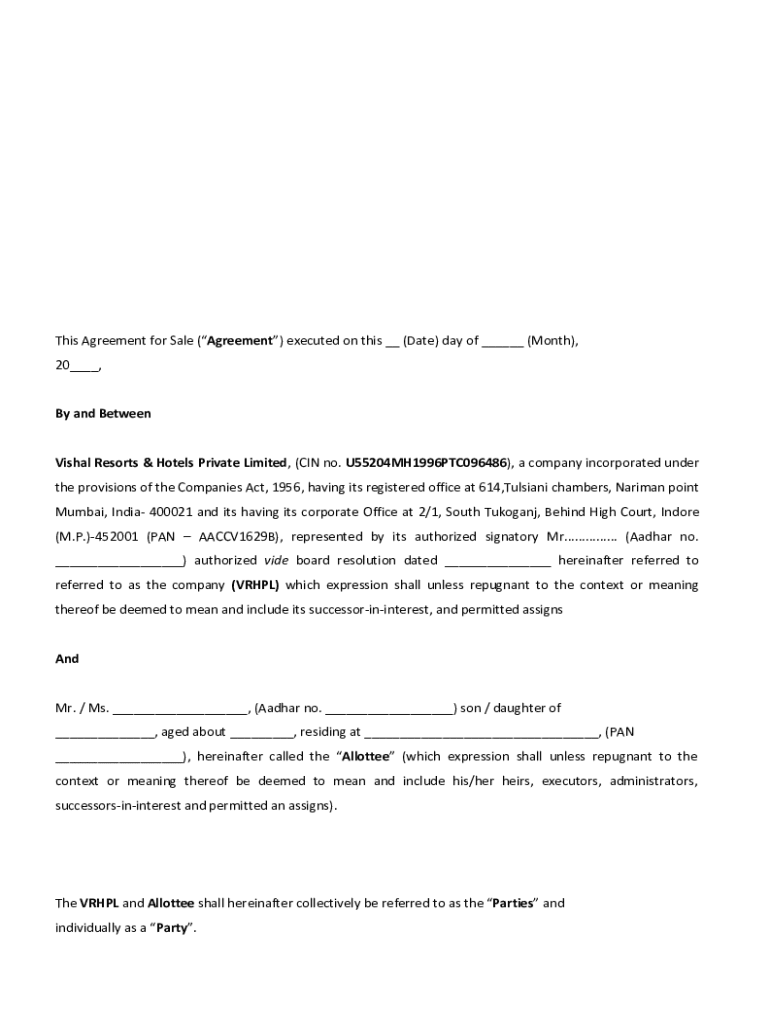 This Agreement for Sale (Agreement) executed on this __ (Date) day of ___ (Month), 20___, By and BetweenVishal Resorts & Hotels Private Limited, (IN no. U55204MH1996PTC096486), a company incorporated