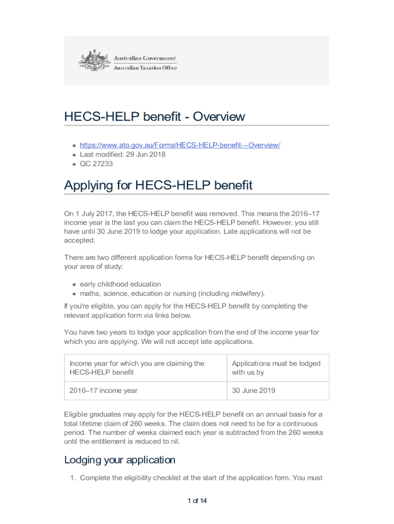 HERSHEL benefit Overview https://www.ato.gov.au/Forms/HECSHELPbenefitOverview/ Last modified: 29 Jun 2018 QC 27233Applying for HERSHEL benefit On 1 July 2017, the HERSHEL benefit was removed. This