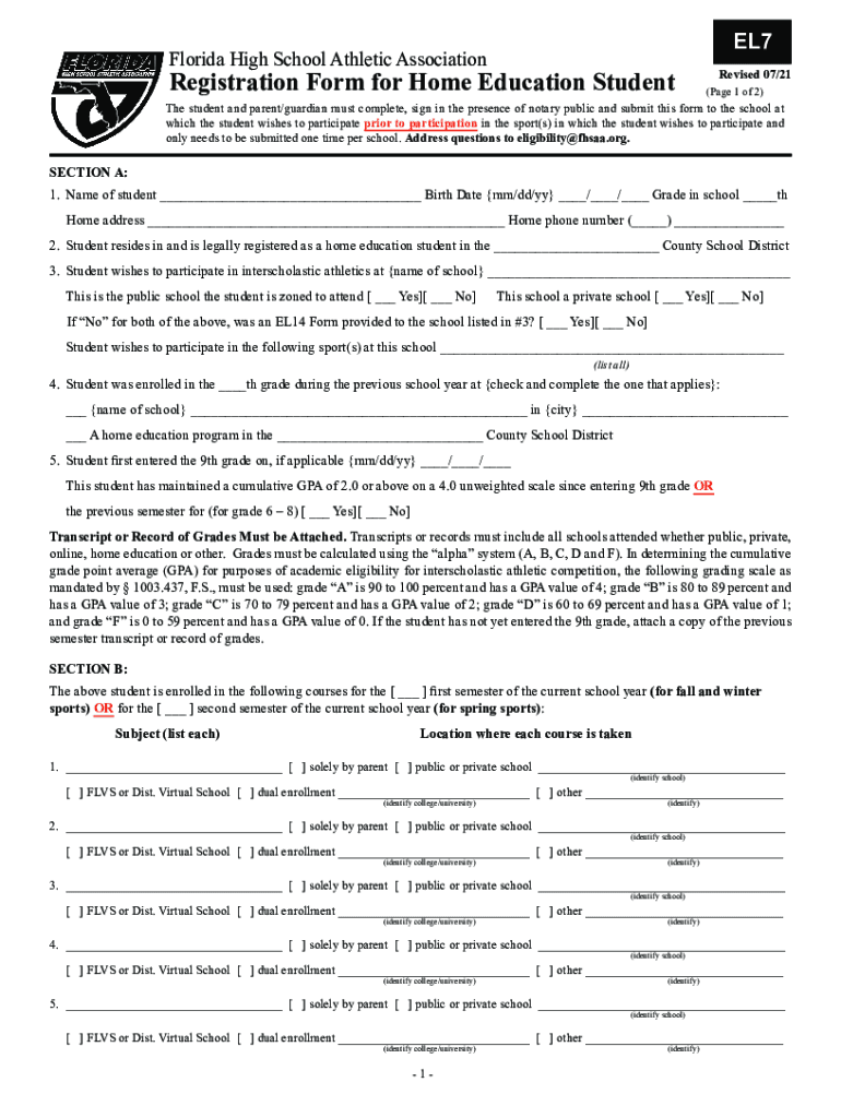 EL7Florida High School Athletic AssociationRegistration Form for Home Education StudentRevised 07/21 (Page 1 of 2)The student and parent/guardian must complete, sign in the presence of notary public