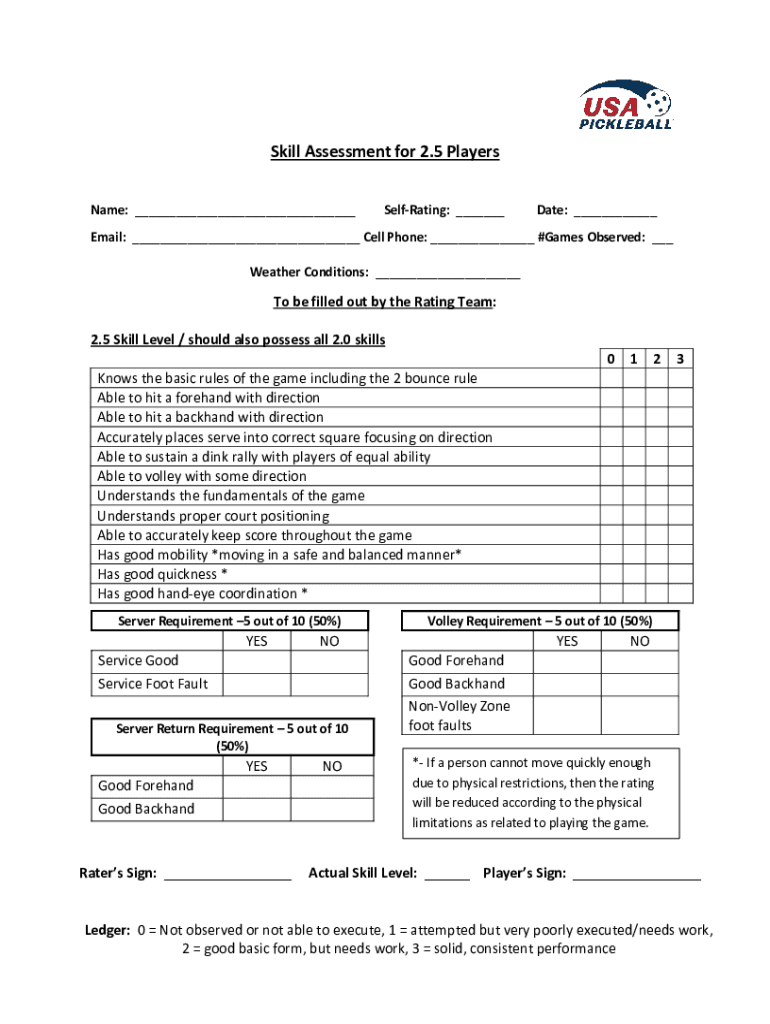 Skill Assessment for 2.5 Players Name: ___Separating: ___Date: ___Email: ___ Cell Phone: ___ #Games Observed: ___ Weather Conditions: ___To be filled out by the Rating Team: 2.5 Skill Level / should