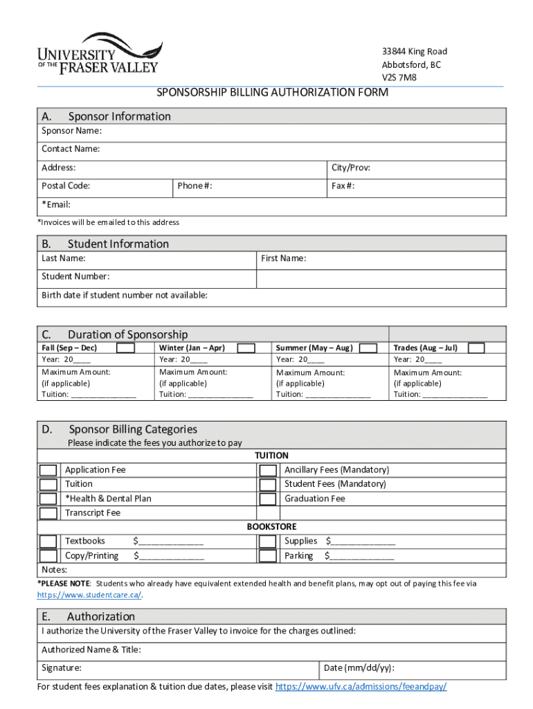 33844KingRoad Abbotsford, BC V2S7M8SPONSORSHIPBILLINGAUTHORIZATIONFORM A. SponsorInformationSponsorName: Contaminate: Address:City/Prov:Postcode:Phone#:Fax#:*Email: *InvoiceswillbeemailedtothisaddressB.