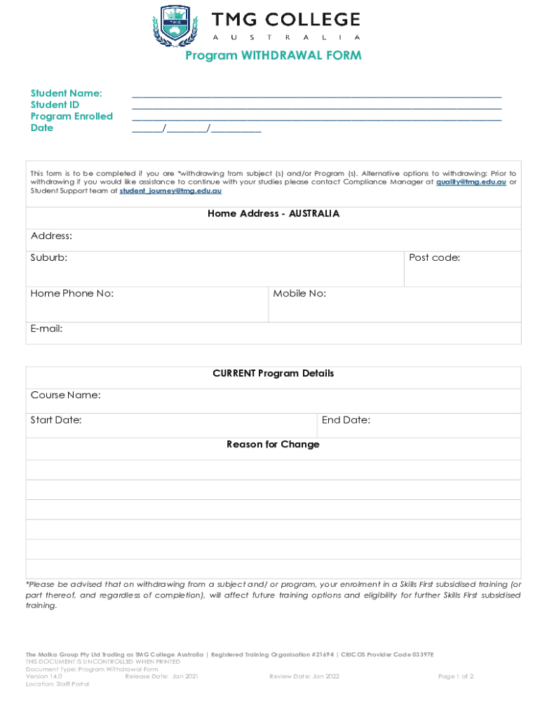 Program WITHDRAWAL FORM Student Name: Student ID Program Enrolled Date___ ___ ___ ___/___/___This form is to be completed if you are *withdrawing from subject (s) and/or Program (s). Alternative options