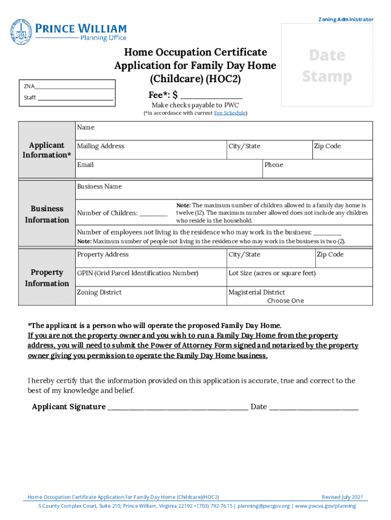 Zoning AdministratorClear Wormhole Occupation Certificate Application for Family Day Home (Childcare) (HOC2)Gradate Stamped*: $ ___Staff:Make checks payable to PwC(*in accordance with current Fee