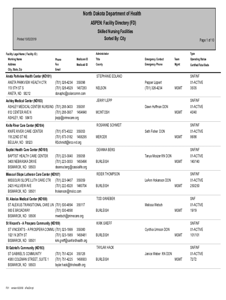 North Dakota Department of Health ASPEN: Facility Directory (FD) Skilled Nursing Facilities Sorted By: Imprinted 10/02/2019Facility Legal Name (Facility ID) Working Name Address City, State, Zapata
