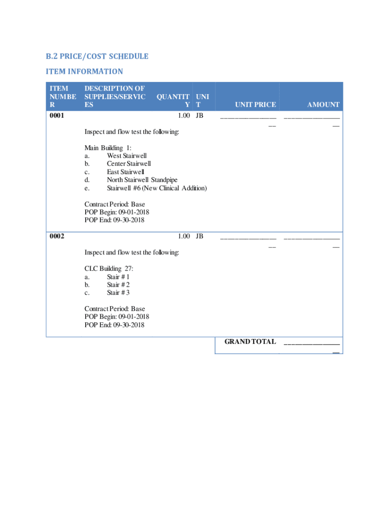 B.2 PRICE/COST SCHEDULE ITEM INFORMATION ITEM NUMBER R 0001DESCRIPTION OF SUPPLIES/SERVICE QUANTITY UNI Y T 1.00 JUnit PRICE ___ __AMOUNT ___ _____ _____ __GRAND TOTAL___ __Inspect and flow test the
