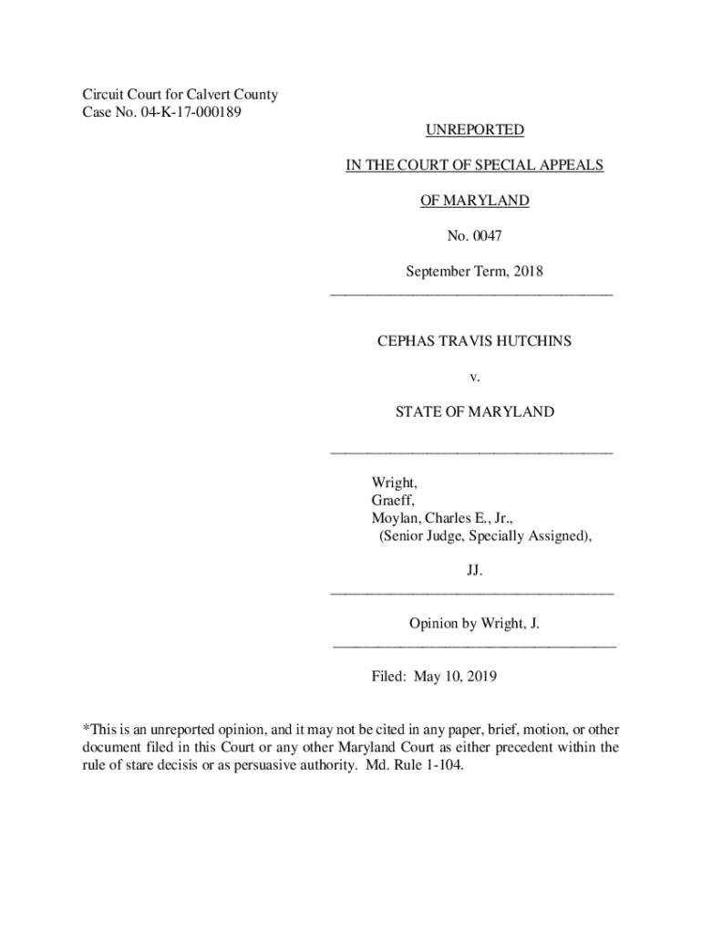 Circuit Court for Calvert County Case No. 04K17000189 UNREPORTED IN THE COURT OF SPECIAL APPEALS OF MARYLAND No. 0047 September Term, 2018 ___ALPHAS TRAVIS HUTCHINS v. STATE OF MARYLAND ___ Wright,
