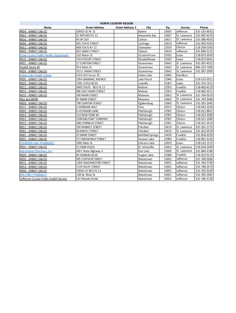 Name #004 KINNEY DRUGS #042 KINNEY DRUGS #016 KINNEY DRUGS #006 KINNEY DRUGS #052 KINNEY DRUGS #048 KINNEY DRUGS Essex County Public Health Department #076 KINNEY DRUGS #001 KINNEY DRUGS Health Direct