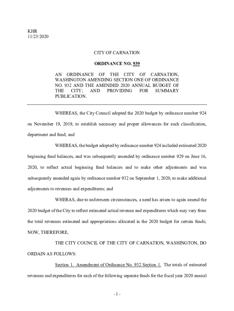 KHR 11/23/2020 CITY OF CARNATION ORDINANCE NO. 939 AN ORDINANCE OF THE CITY OF CARNATION, WASHINGTON AMENDING SECTION ONE OF ORDINANCE NO. 932 AND THE AMENDED 2020 ANNUAL BUDGET OF THE CITY; AND PROVIDING