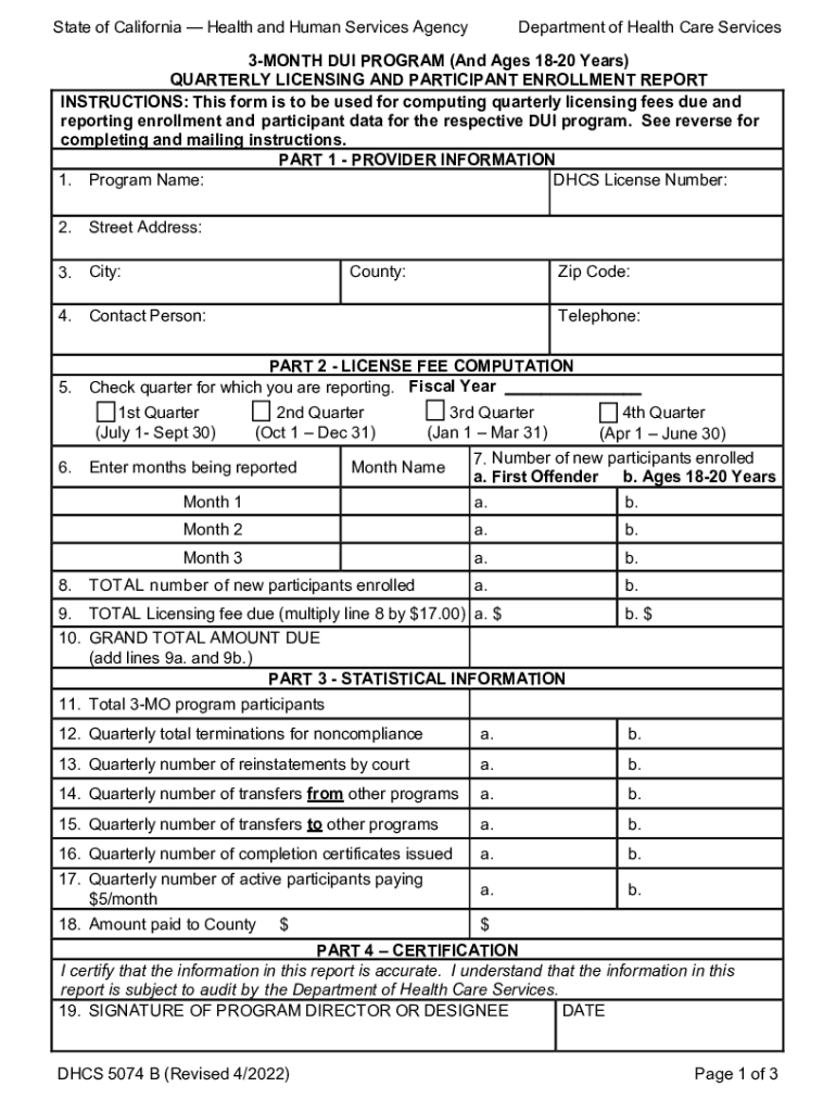 State of California Health and Human Services AgencyDepartment of Health Care Services3MONTH DUI PROGRAM (And Ages 1820 Years) QUARTERLY LICENSING AND PARTICIPANT ENROLLMENT REPORT INSTRUCTIONS: This