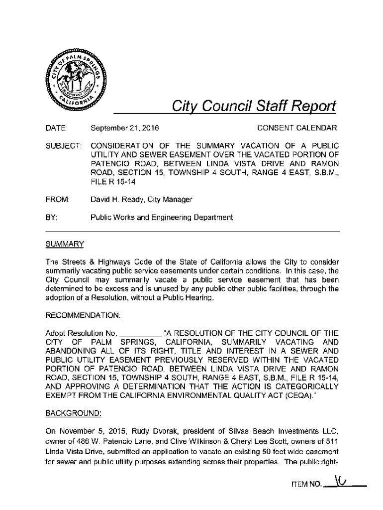 City Council Staff Report DATE:September 21, 2016SUBJECT:CONSIDERATION OF THE SUMMARY VACATION OF A PUBLIC UTILITY AND SEWER EASEMENT OVER THE VACATED PORTION OF PATRICIO ROAD, BETWEEN LINDA VISTA