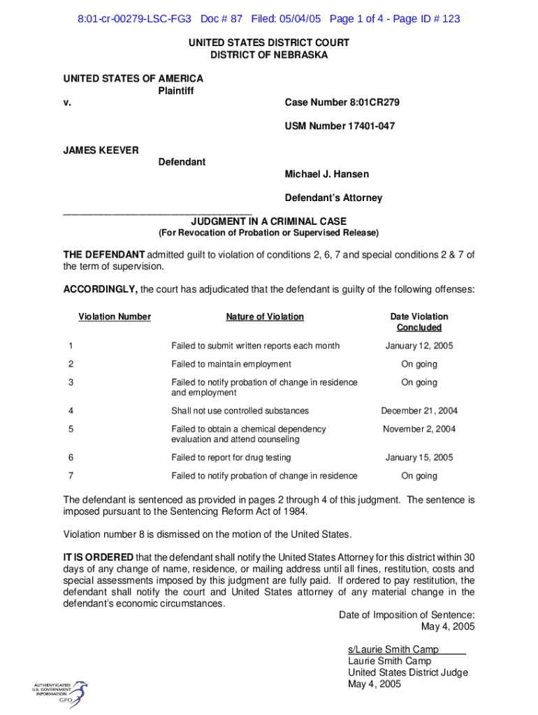 8:01cr00279LSCFG3 Doc # 87 Filed: 05/04/05-Page 1 of 4-Page ID # 123 UNITED STATES DISTRICT COURT DISTRICT OF NEBRASKA UNITED STATES OF AMERICA Plaintiff v. Case Number 8:01CR279 US Number 17401047JAMES