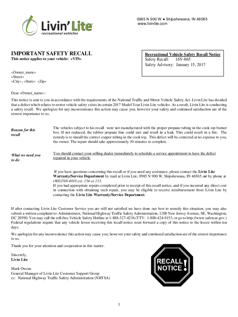 0985 N 900 W Shipshewana, IN 46565 www.livinlite.comIMPORTANT SAFETY RECALLRecreational Vehicle Safety Recall Notice Safety Recall: 16V865 Safety Advisory: January 15, 2017This notice applies to your